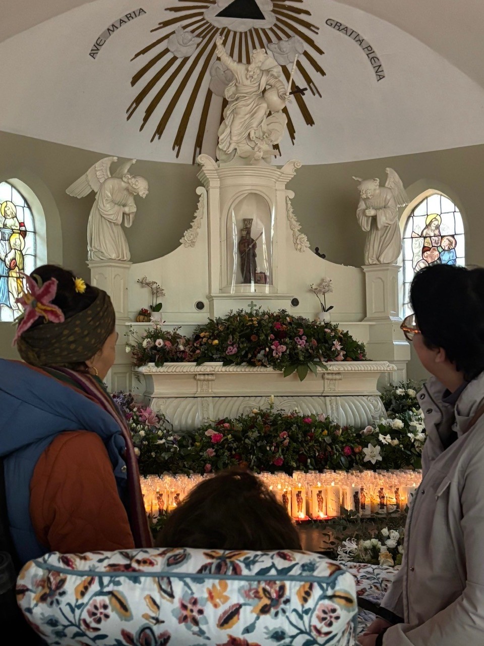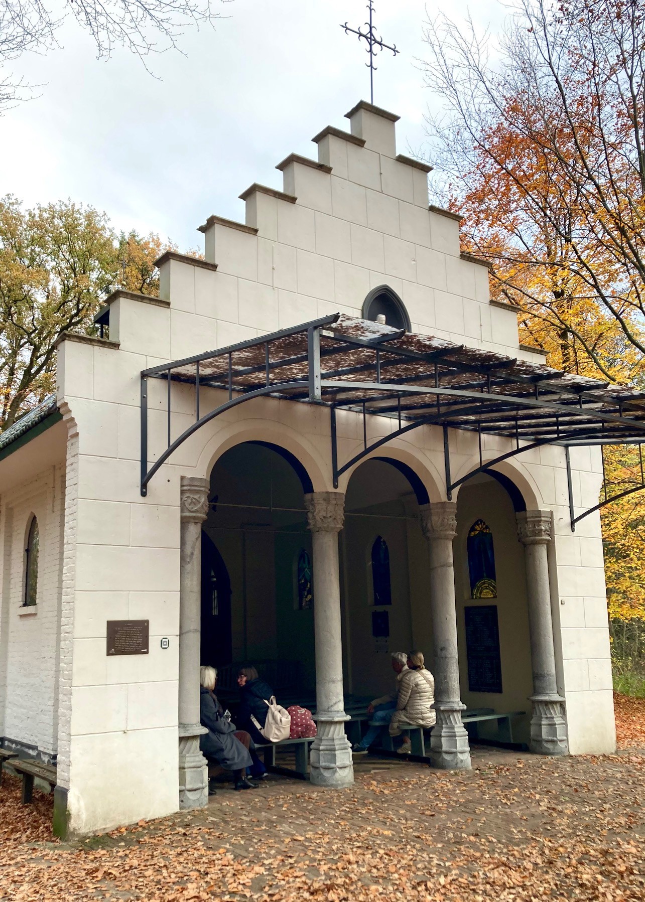 Bij de kapel van de Heilige Eik stonden vrienden en familie te wachten. Wat een verrassing. Met zijn drieën eerst even een intens moment van samenzijn in de kapel … Wat was het daar een verrassende bloemenzee. Dit moest zo zijn… Daarna bijkletsen met de vrienden en familie.