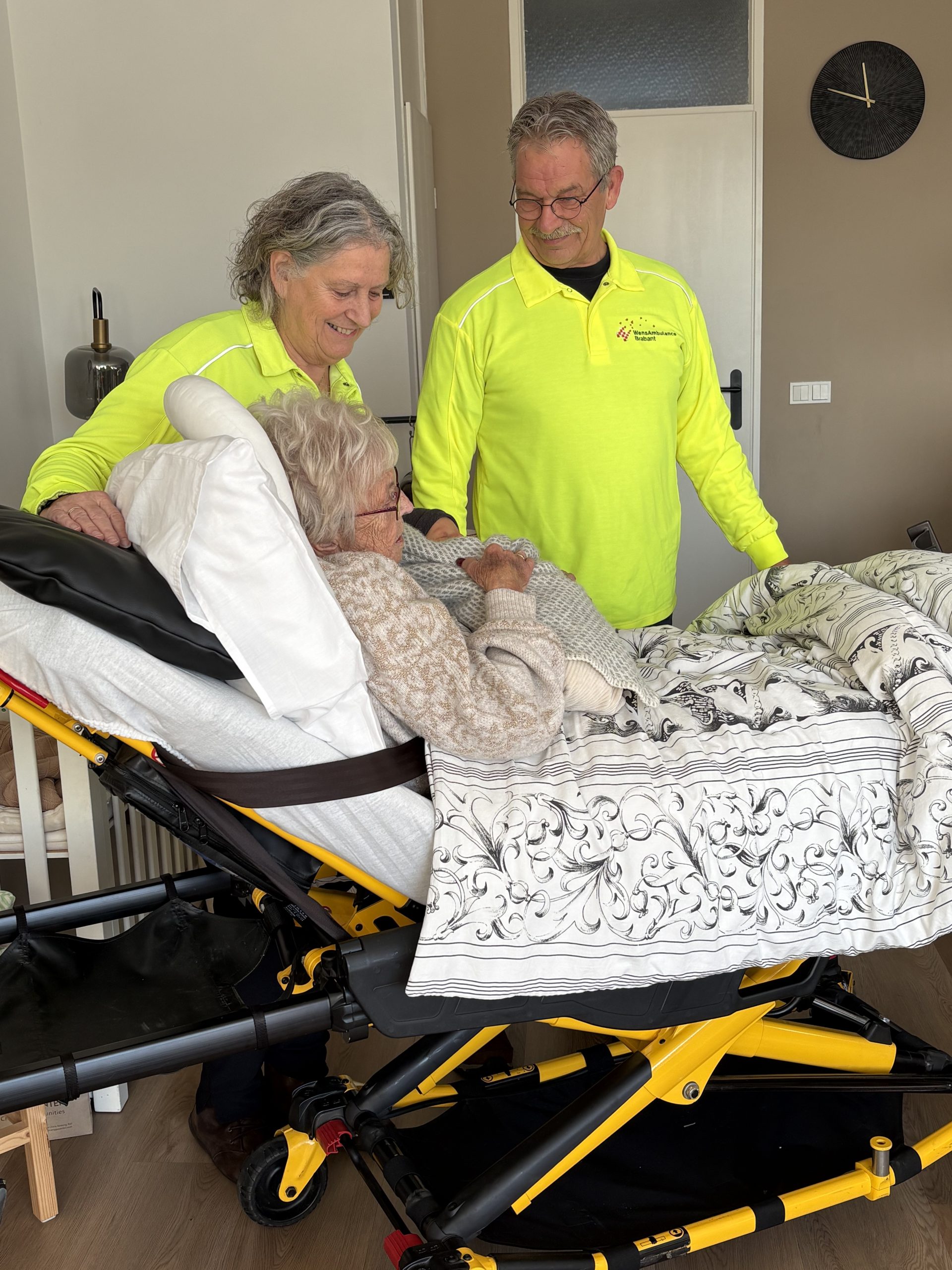 Op de dag van onze wens werd mijn moeder thuis opgehaald door 2 vrijwilligers die haar zorgvuldig vanuit haar zorgbed zeer comfortabel op de brancard installeerden. Lekker in de kussens en onder het dekbed lag ze heerlijk in de ambulance door de grote ramen naar buiten te kijken. De verpleegkundige en ik zaten bij haar in de cabine, en mijn vader reed voor mee bij de chauffeur. Na een klein uurtje rijden kwamen we aan bij het huis van mijn dochter, haar man en de 2 kleinkinderen. Via het pad achterom en de achterdeur werd de brancard de woonkamer binnen gereden en heeft mijn moeder in levenden lijve kennis mogen maken met de baby. Wat een geluksmoment was dat, toen ze hem in haar armen kon nemen, hem in het echt kon zien, en die kleine vingertjes in haar hand kon vasthouden. Wie had gedacht dat ze dit prachtige moment nog zou kunnen meemaken! Dit is alleen maar te danken aan WensAmbulance Brabant, en dat ze dit nog voor mijn moeder hebben gedaan. Werkelijk een fantastisch en memorabel kraambezoek.