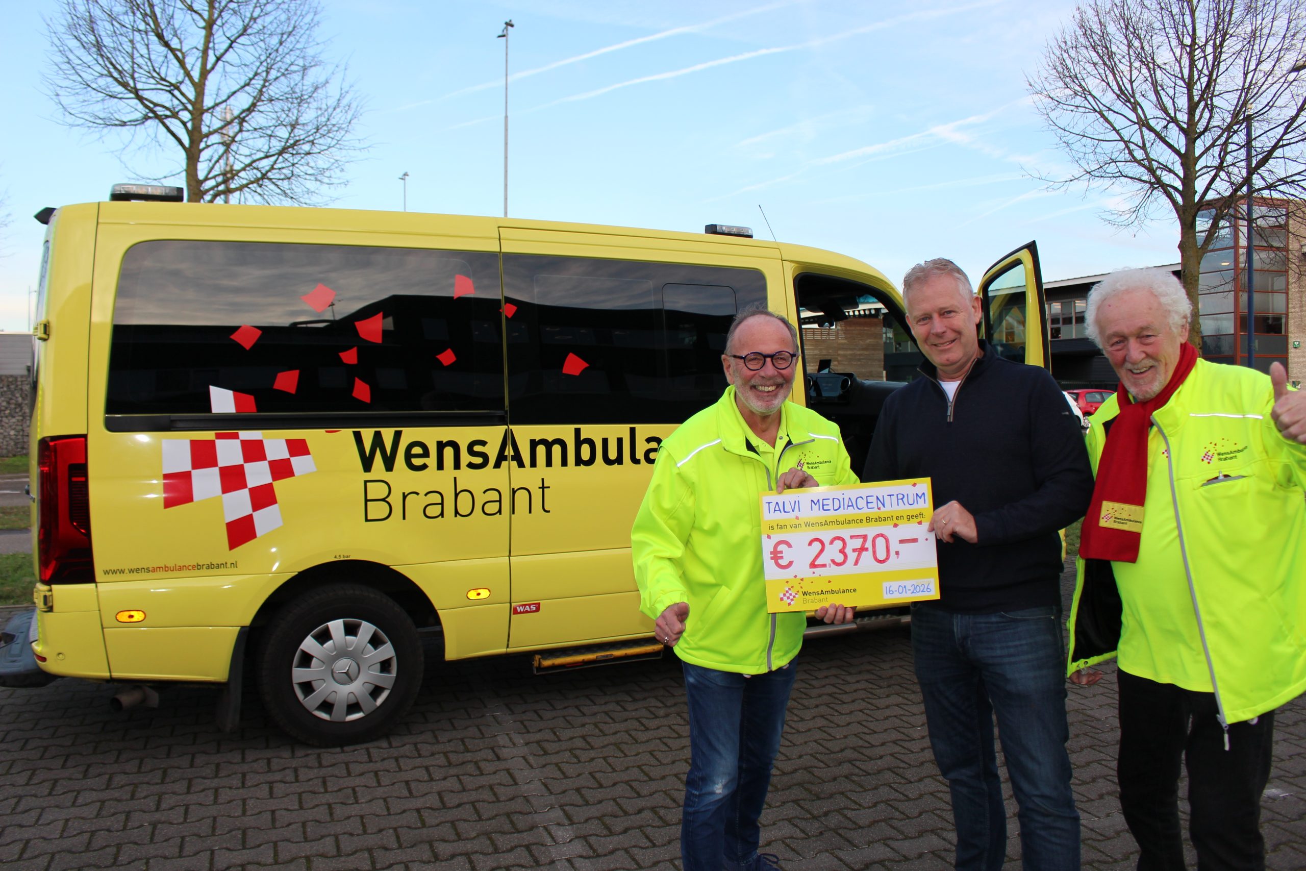 Op vrijdagochtend 16 januari ontvingen Albert en Barry namens WensAmbulance Brabant een prachtig bedrag van € 2370,- uit handen van Jeroen van der Horst. Dit bedrag komt uit de kerstactie, die Talvi organiseerde voor bedrijven in alle weekbladen o.a. Udens Weekblad.